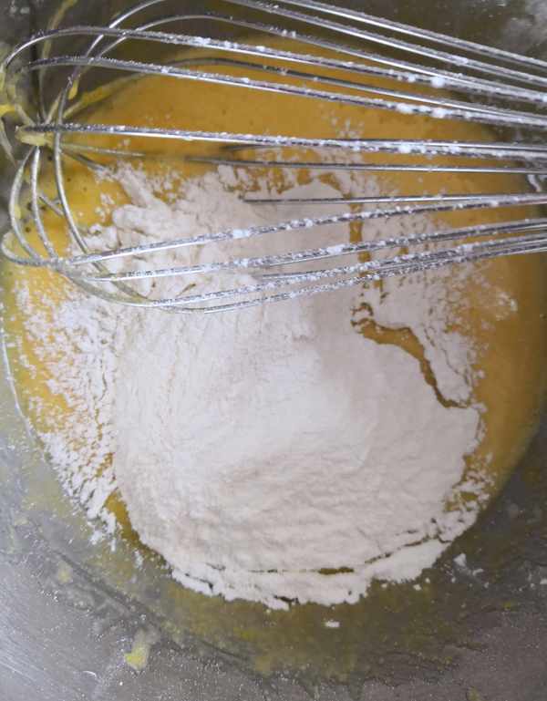 2、加入過篩的面粉,不規則拌勻。