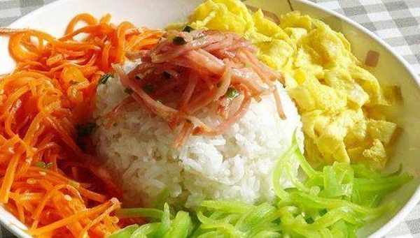 做法:1. 紅蘿卜、黃瓜、火腿片分別切細絲,蔥切蔥花,雞蛋放點鹽打散。