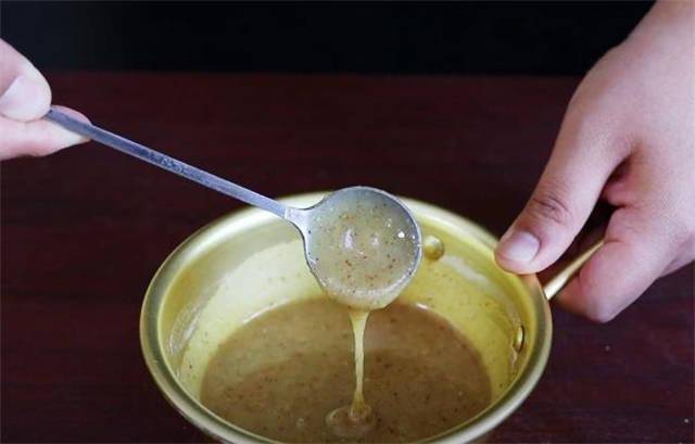 3.這時候做油酥面,40g的食用油倒在40g的面粉裡面,一勺鹽,再加入現場現磨的花椒面,攪拌好的狀態就是這種細膩順滑的酸奶狀。