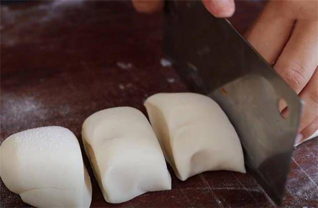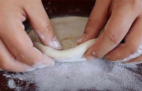 8.小尾巴藏在下面,直接按扁,生坯就做好瞭,再用搟面杖搟開,大概這個厚度就可以。