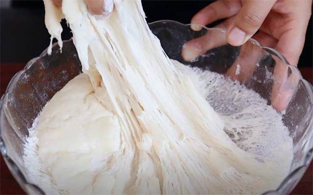 2.現在我們再來和面,準備上300g的普通面粉,用剛才攪拌好的酵母水直接和面,為瞭避免揉起來過於黏手,這裡咱們加一點食用油,稍微的攪兩下就開始揉面,這個比例的面團很好揉,這是我揉瞭不到五分鐘的狀態,就已經很光滑瞭,密封好放到一邊去發酵。