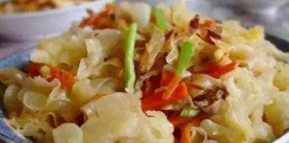 1.將銀耳浸泡12小時。泡發後洗凈,用剪刀剪去根部的黃色硬結。用手將銀耳撕碎。豬裡脊切成細絲,用紹酒,醬油和淀粉抓拌均勻後醃制10分鐘。青紅椒去蒂去籽洗凈後,切成細絲。大蔥切細絲。