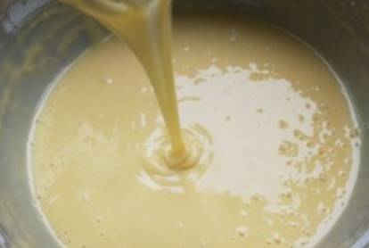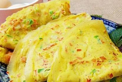 第四步,在平底不粘鍋中添上適量的食用油,待油燒熱後,用勺子將面糊舀放入鍋中,晃動鍋體,使其均勻流淌在鍋底,待鋪滿鍋底後,即可開始煎制;