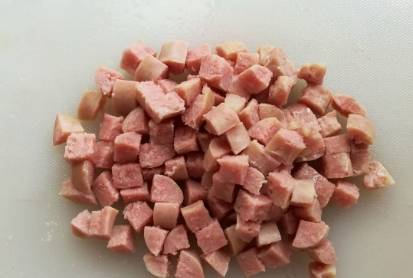 第二步,臘腸或者是火腿腸,取出適量用,切成小小的丁,還可以搭配一些自己喜歡的其他食材,接著在打散的蛋液中,分次少許的加上適量的面粉,直到將蛋液攪成團;