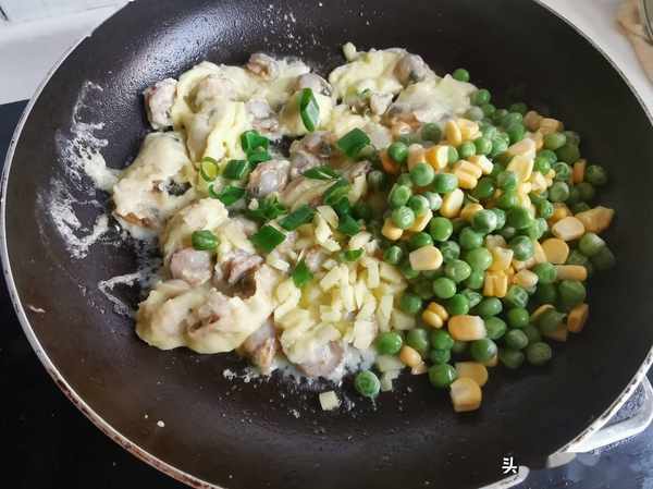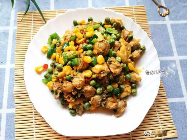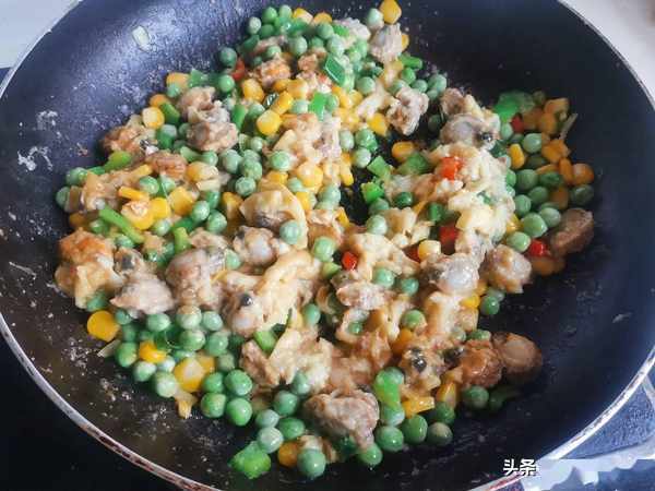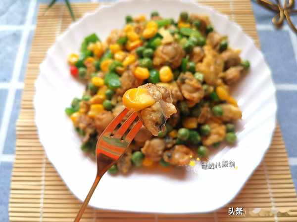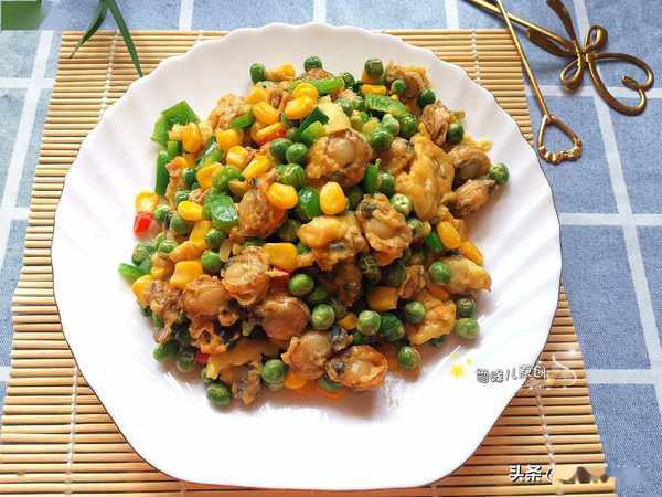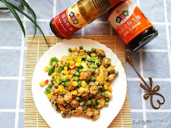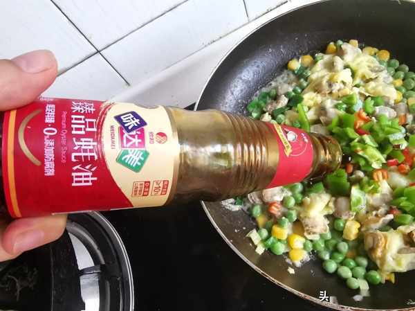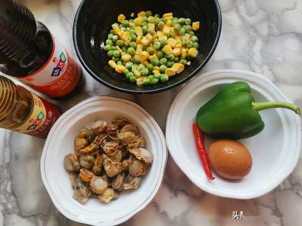 所用資料:扇貝肉適量,玉米粒,豌豆粒,青甜椒,紅辣椒,雞蛋1個,鹽少許,葱末,薑末,欣和蚝油,生抽,花生油1勺。