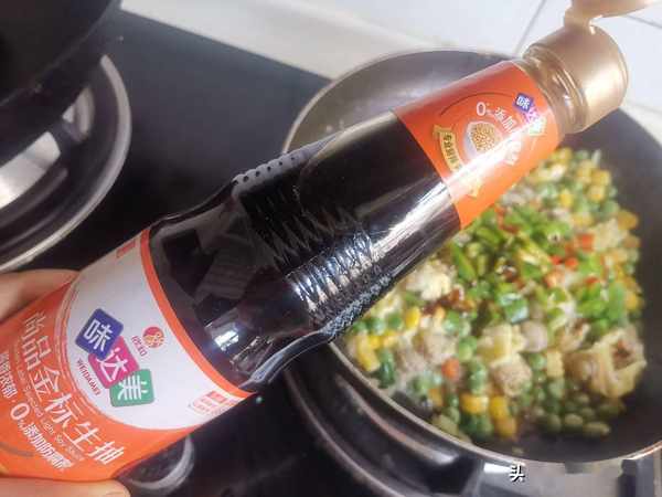 第五步:加青甜椒粒和紅椒粒,再入少許蚝油新增鮮甜的味道。