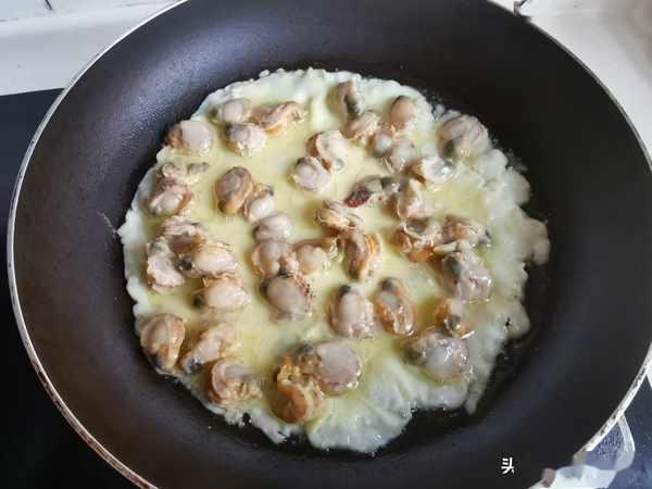 第三步:把扇貝肉和雞蛋一起倒入鍋裏,翻炒均勻,煎成塊。