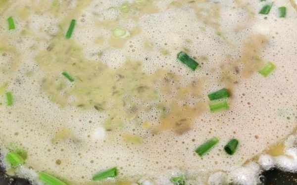 第四步:鍋內加上一定量的食用油,燒熱。油溫升高以後把香椿雞蛋倒進鍋裡,先不要翻動,等其稍微凝固之後再慢慢翻動它,直到將其炒熟就能夠出鍋瞭。