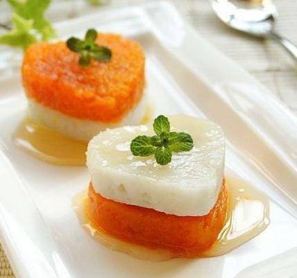 做法:山藥洗凈去皮洗凈切成片,鍋中燒水,水開後放入山藥片焯熟,撈出,用心形模具壓好,擺在盤中,胡蘿卜洗凈切成小的菱形片,擺在山藥片上,擺在盤中。澆上蜂蜜後即可食用。