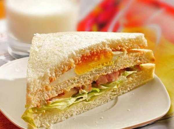 把土司片鋪在案板上,加入生菜絲,擠上沙拉醬。再加上火腿片,放上奶酪片,再蓋上一層土司片,用刀對角切開,即可食用。