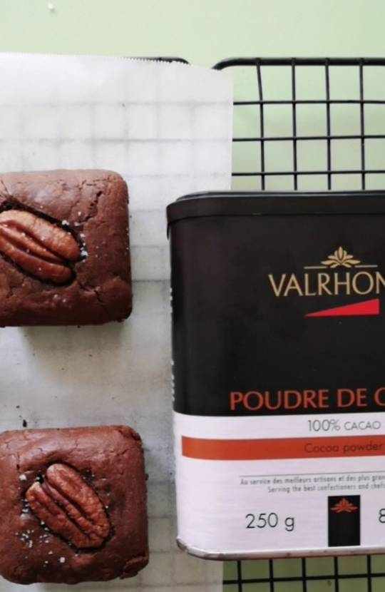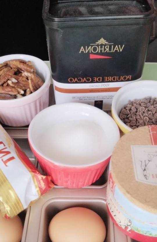 低筋面粉100克、黃油100+15克、黑巧克力100克、碧根果100克、雞蛋2個、可可粉20克、細砂糖100克、海鹽適量