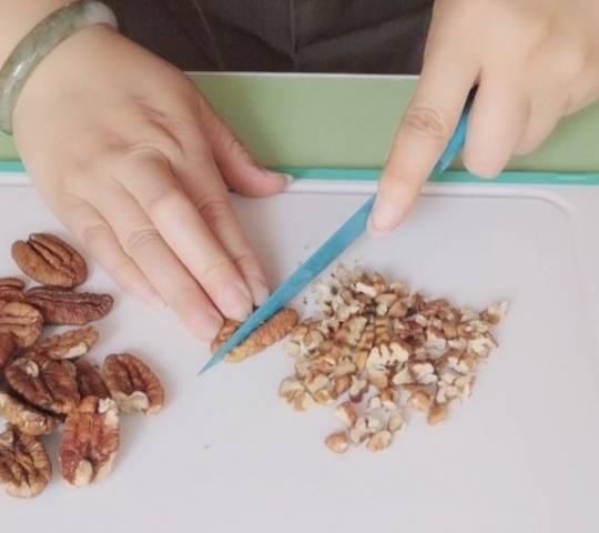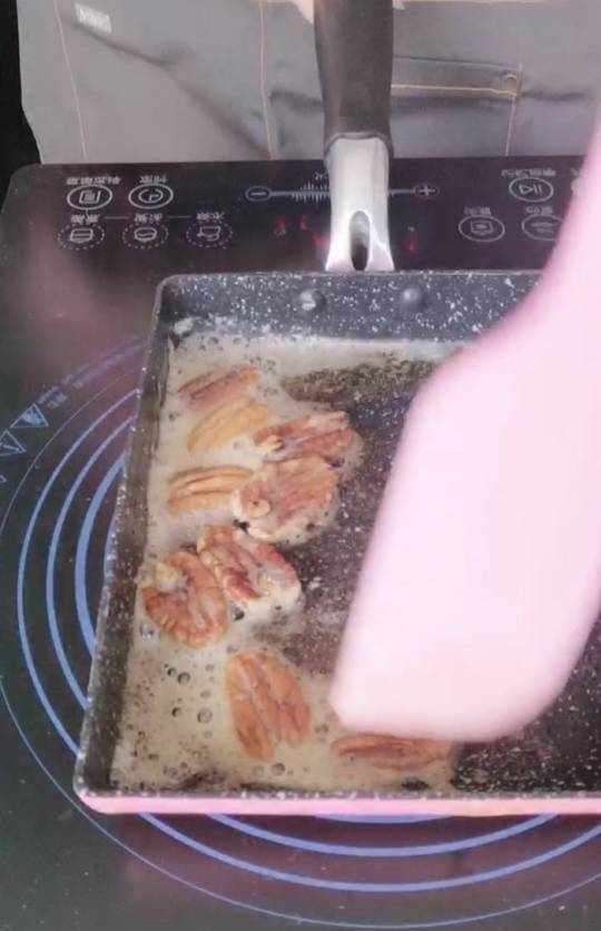 2.15克黃油平底鍋融化,放入6顆碧根果翻炒。