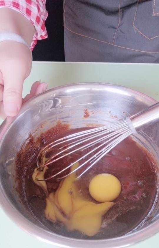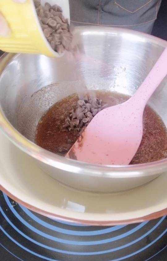 6.黃油隔水融化。黃油融化後倒入巧克力融化。