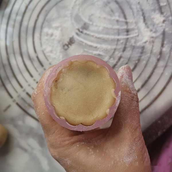 第六步:把月餅模具中撒少許麵粉,把包好的圓球放入。