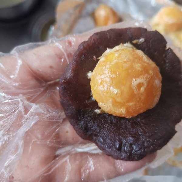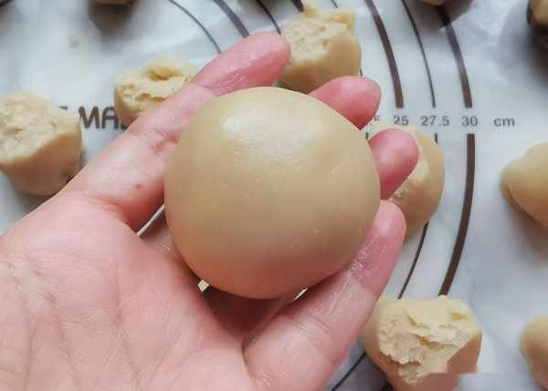 第五步:把麵團拿出,分割成25克的小劑子,按扁,把餡料包入,收口團成圓球。