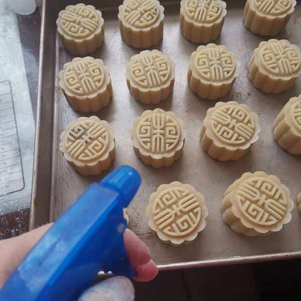 第八步:把做好的月餅放入烤盤,噴上薄薄的一層水,烤箱200度,烤5分鐘定型,拿出刷上薄薄的一層蛋黃液(蛋黃液是按照一個蛋黃加上一點點清水拌勻而成)。