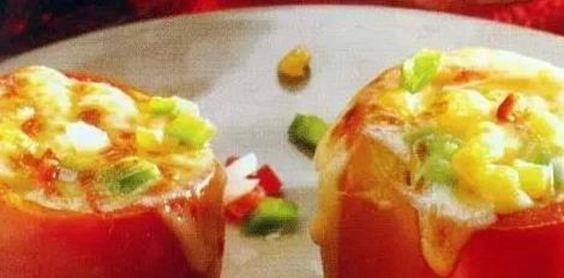 3、在西紅柿碗上蓋上芝士片,移入烤箱,焗成金黃色即可。