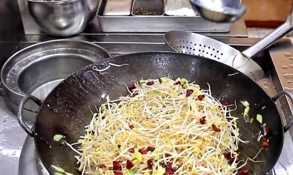 鍋裡加入一勺植物油,油溫五成熱時,倒入蔥薑和幹辣椒,開小火把它們炒香,這一步溫度不能太高,否則容易把辣椒炒糊,翻炒一會後,辣椒炒出香味,看到微微變色,倒入綠豆芽,開大火進行翻炒,讓水分快速蒸發,沿鍋邊淋入適量的白醋,使豆芽更加的清脆,大約翻炒一分鐘,加入食鹽八克,胡椒粉五克,雞精六克,快速翻炒化開調料,再放入青椒絲,翻炒幾下,即可裝盤上桌。