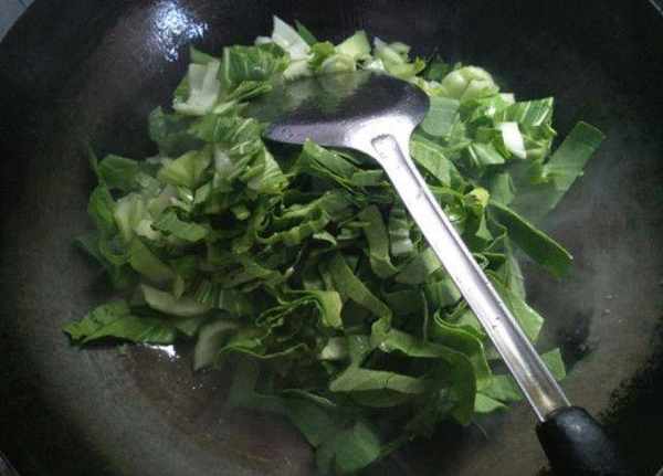 第三步,待油熱至微微冒煙的時候,倒入切碎的青菜,迅速的翻炒幾下,盡量讓菜葉子都沾到油,防止底下的菜葉子遇油高溫炒焦,而表面的菜卻沒沾到油