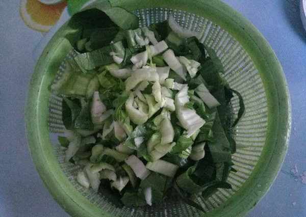 制作過程:第一步,將大顆青菜準備好,用清水沖洗幹凈後,切碎,因為我選用的青菜比較大顆,所以為瞭剛好的入味,我是選擇切碎瞭炒的