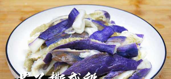 蒸熟後的茄子表面就會有皺紋,然後質地也會變軟,煮成這樣就可以啦。然後將煮熟的茄子,從鍋中拿出來放涼。放涼之後,我們再用手將茄子一瓣一瓣地撕下來,撕下來的茄子就會變成一條一條的,全部撕好之後就可以裝入盤中備用。