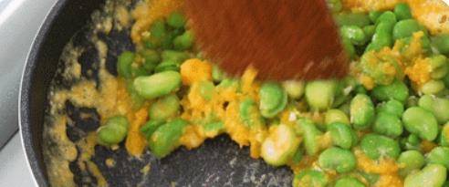 接著撈出來之後,我把蠶豆的裡面放一個蛋黃,它不是咸的,咱們就把普通的雞蛋蛋黃放進去,然後抓一抓,讓每一個豆粒的表面上都沾上瞭咸蛋蛋黃液。