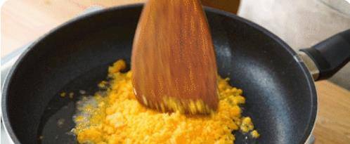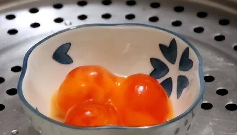 最後準備6個咸鴨蛋,黃蛋黃放在1個碗裡頭,然後拿筷子給它懟碎瞭,懟碎瞭碗之後裡面加一點點的鹽,一點點的雞粉,再來一點點的香油,然後碾一碾,它就呈那種起沙的狀態,然後我們大勺整的幹凈的滑溜的,