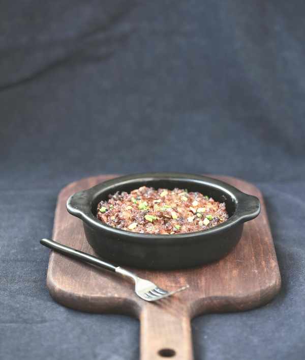 烹飪tips:1.烤碗中總共放瞭兩層茄子片和兩層肉餡,每層茄子片上都要淋一點花生油,這樣口感不會太幹。