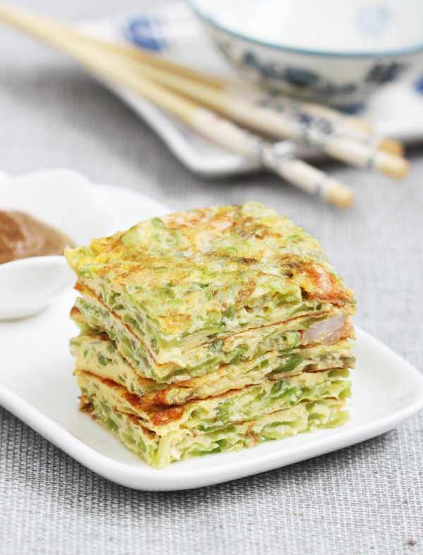 8.鍋中倒油,將調好的雞蛋液倒入鍋中煎至兩面金黃,出鍋裝盤後將調好的麻醬汁澆在上面即可。