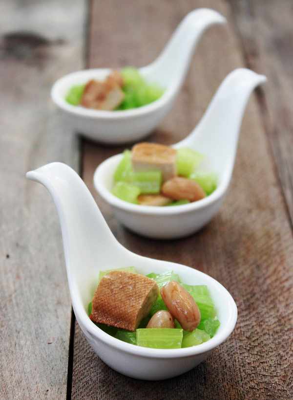 5、花生米、西芹、豆幹焯水後倒入盆中,放入鹽、花椒油、雞精、香油拌勻即可