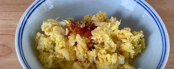 第6步、窩窩在蒸煮的過程中,可以調制一碗自己喜歡的料汁,我這裡是用蒜泥加一個熟雞蛋攪拌的,加入一點香油和生抽,多點的米醋即可。