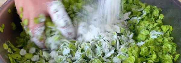 第1步、首先把榆錢根蒂摘掉,不然做出來的窩窩口感會發粘,處理完後,用清水加入食鹽和面粉攪拌均勻後,浸泡10分鐘左右,這樣能夠更加的清洗幹凈。