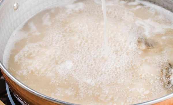 3、熬高湯不要用鐵鍋,瓦罐最好。鍋中倒入30斤清水,加入雞鴨塊,2斤豬大骨敲斷放入。這麼做是為瞭讓骨油流出來溶解在湯中,使湯更美味。放老薑200克,50度的高度數的白酒,高度數白酒可以鎮住食材腥臊味。