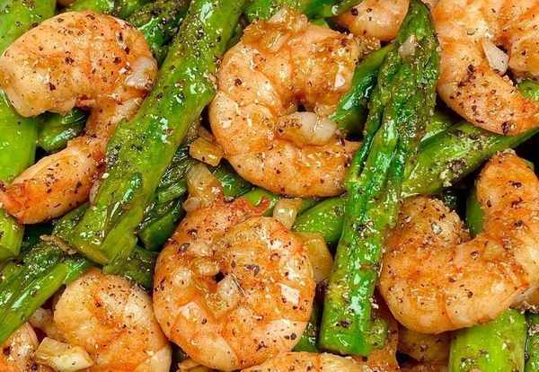 3、起鍋燒油,油熱後放入蒜末爆香,再放入醃制好的蝦仁翻炒一會兒,炒至蝦仁變色後,放入蘆筍翻炒均勻。