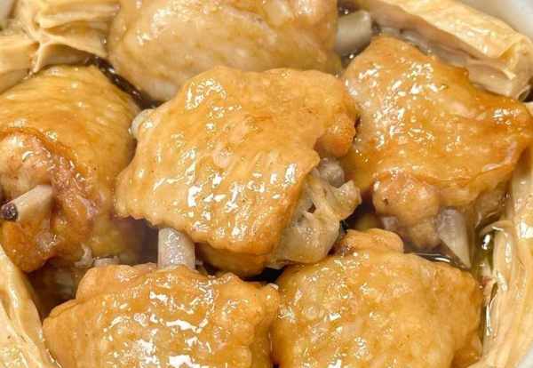 3、腐竹提前浸泡,泡軟後切成小段,擺放在盤子底部,再鋪上醃制好的雞中翅,醃制的料汁也倒進來。