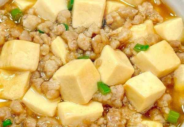 3、起鍋燒油,油熱後放入醃制過的肉末翻炒一會兒,炒至變色後放入切成小塊的嫩豆腐,倒入醬汁,輕輕地翻動幾下,再蓋上蓋子燜煮一會兒。
