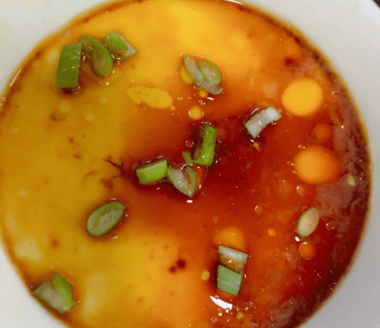 取出後在碗裡倒入少量香油抹平,讓整個面都沾上。用勺子在蛋液上劃成十字格,倒入生抽轉一轉碗讓香油和生抽流進下面的蛋羹裡面。