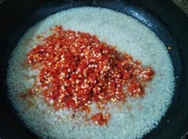 第五步,緊接著倒上辣椒碎,翻炒至變色即可