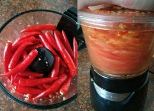 第二步,紅辣椒清洗幹凈後,控幹水分,同樣放入絞肉機,絞碎後盛出
