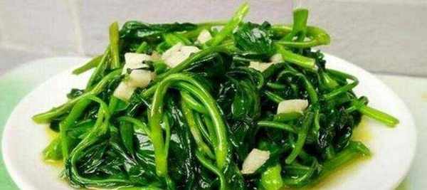 2、下空心菜,大火翻炒幾下,炒到菜葉打蔫,然後加適量的鹽,把剩下的一般蒜末扔進去,起鍋。