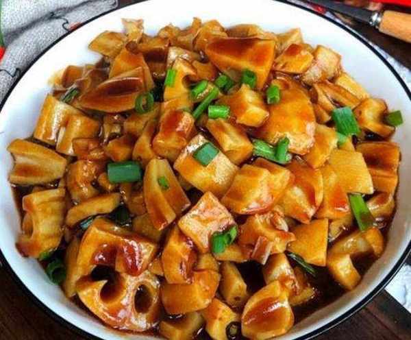 4.炒鍋中加入油,燒熱後倒入藕丁大火翻炒,然後倒入調好的醬汁上色,最後淋上水淀粉,大火翻炒收汁,出鍋前撒上蔥花,搞定!