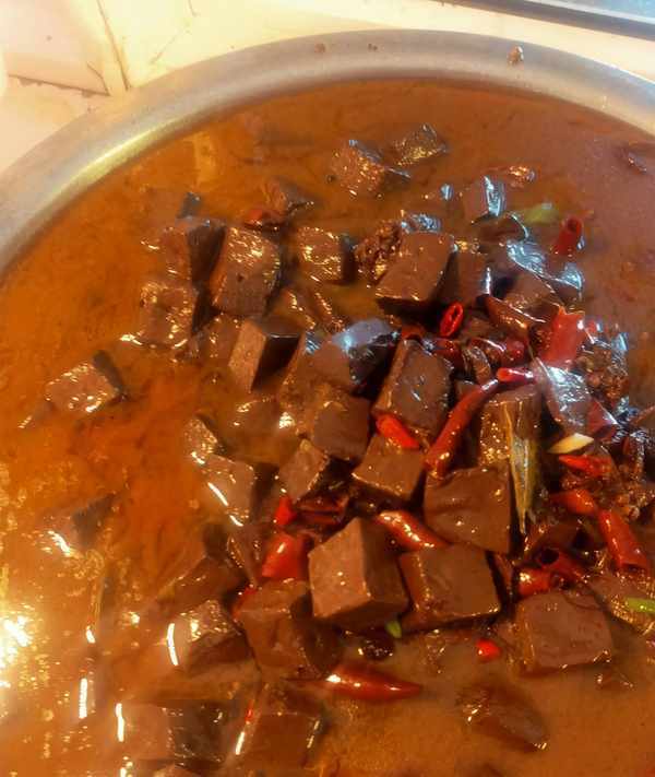 鴨血切成片,鍋內加水燒開下入鴨血,過水打去浮沫出鍋沖洗幹凈。
