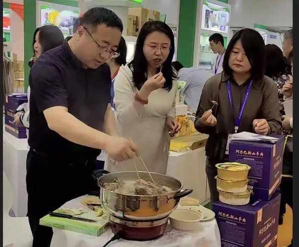 天然、綠色、高品質的阿爾巴斯山羊肉和鄂托克牛、木凱淖爾土雞等美味的預制菜品,經過簡單的加工,十幾分鐘就能輕松烹煮出草原美味,香噴噴的鄂托克美味在博覽會現場香味縈繞,吸引著一群又一群參展者駐足品嘗。鮮香稚嫩的阿爾巴斯山羊肉讓品嘗者們不斷發出贊嘆的呼聲,久久都不願離去。博覽會現場有百餘人同阿爾巴斯山羊肉企業互留聯系方式,初步溝通瞭合作意向。