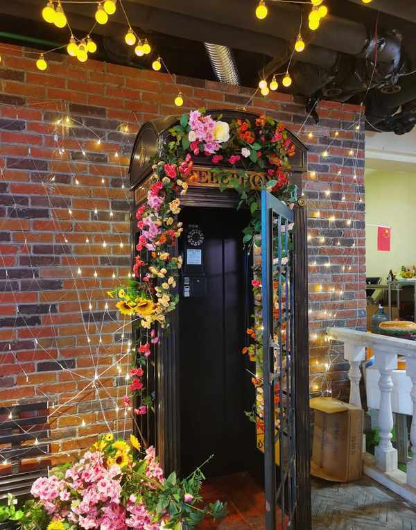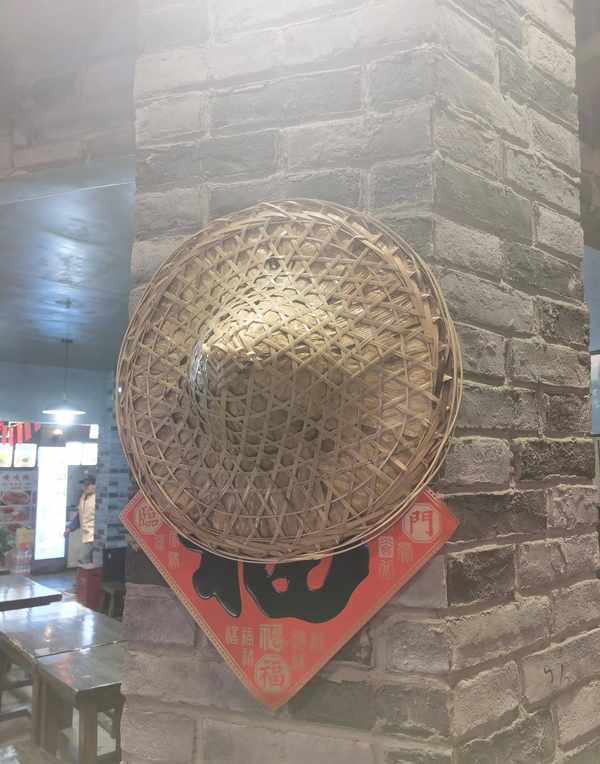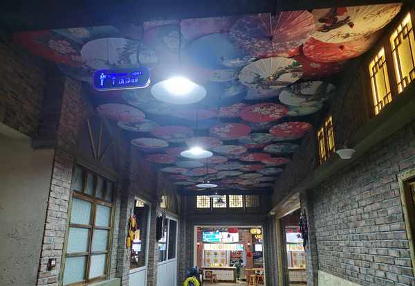 原來這裡不是什麼古跡,是一個室內小吃街,相比李村夜市、小吃街來說,這裡環境更好一些,還有凳子,在室內冬暖夏涼,不怕刮風下雨,不用日曬雨淋,可全天候開放。進入之後,裡面是民國風格的裝修,還有一些掛件、擺件,如掛鐘、竹編鬥笠帽、電話亭等,復古風十足,過道頂上掛滿瞭彩色紙傘。