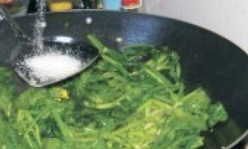 4、起鍋熱油,油熟後放入蒜末煸炒出香味,然後倒入菠菜,大火快速翻炒均勻,差不多十幾秒。放點鹽,隻放點鹽。