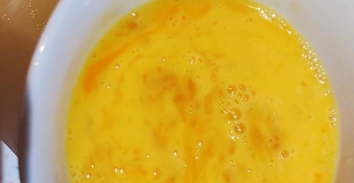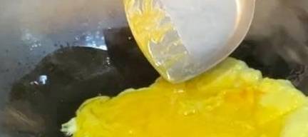 2、?鍋中放入適量的花生油,燒至七成熱,然後將準備好的雞蛋液倒入鍋中,小火慢炒,炒雞蛋時要翻過來炒,雞蛋要炒的嫩一些,不要炒老瞭,熟後從鍋裡到出來備用。