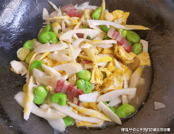 4、臘肉顏色透明過後加入春筍片、蠶豆瓣,大火翻炒2分鐘,加入適量生抽、食鹽調味,淋入適量清水煮開,放入雞蛋塊,小火燒至湯汁濃鬱,即可關火出鍋。