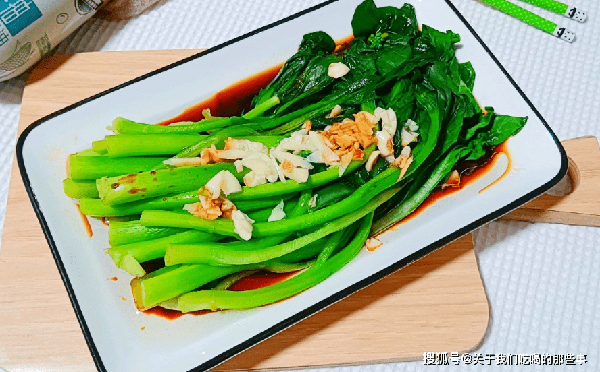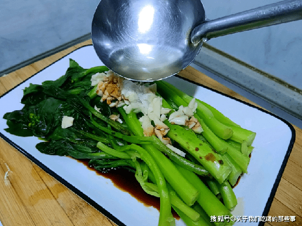 2、蒜瓣去皮切末,放在菜心上,淋入適量生抽。鍋裡倒入適量油,燒熱後把熱油澆在蒜末上爆香,翻拌均勻即可食用,口味清新鮮美。