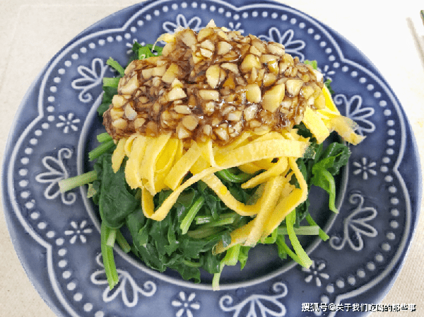 4、把雞蛋絲、菠菜放入大碗中,上面放上蒜末,鍋裡倒入適量油燒熱,把熱油潑在蒜末上激發香味,然後加入碗裡的料汁拌勻。