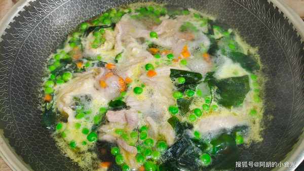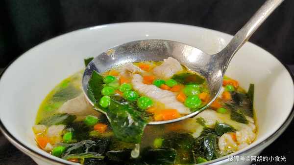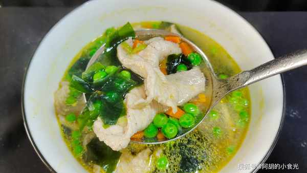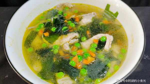 此湯做法雖簡單,但是肉片滑嫩,豌豆粒鮮甜適口,輔以裙帶菜和胡蘿卜讓湯水也更加鮮美營養,不知道吃什麼得可以將此湯列入你得菜譜中去。